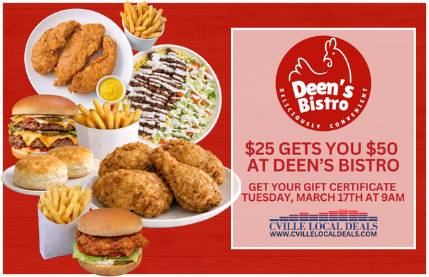 Double your deliciousness! With Cville Local Deals, just $25 gets you $50 to spend at Deen’s Bistro! Snag your gift certificate Tuesday, March 17th at 9am — before they’re gone!