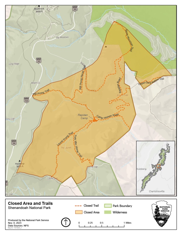 LURAY, VA – Shenandoah National Park has closed the Rapidan Camp area near the eastern boundary in the central section of the park (see map) due to a wildfire. The closure includes the area around the historic camp and the trails leading to it including the following: